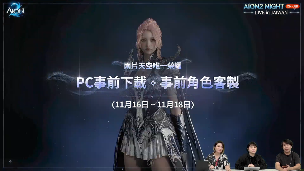 NCSOFT 今(11)日宣布,旗下最新 MMORPG《AION 2》将于 11 月 18 日晚间在台湾、韩国同步上市,游戏今(11)日正式在台展开事前预约。