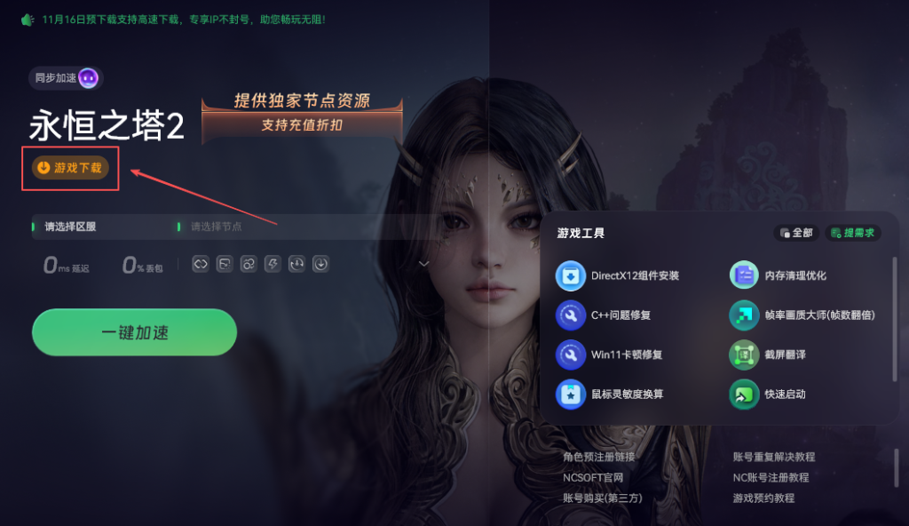 注册完成后,回到启动器主界面,找到《永恒之塔2》的游戏图标,点击“预约安装”按钮。系统会自动下载必要的游戏资源,全部完成后就可以等游戏开放,直接登录体验了。