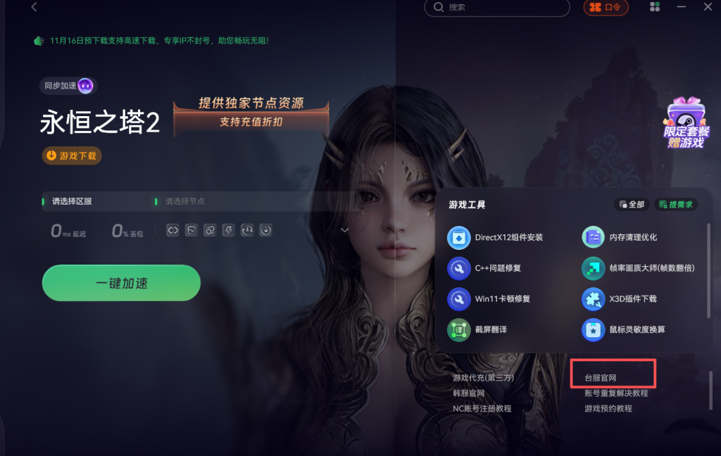 为确保官网访问及后续操作的稳定性,建议使用区域加速工具。选择永恒之塔2台服节点进行专项加速,待加速状态显示连接成功后,点击工具界面内嵌的官网入口进行跳转。
