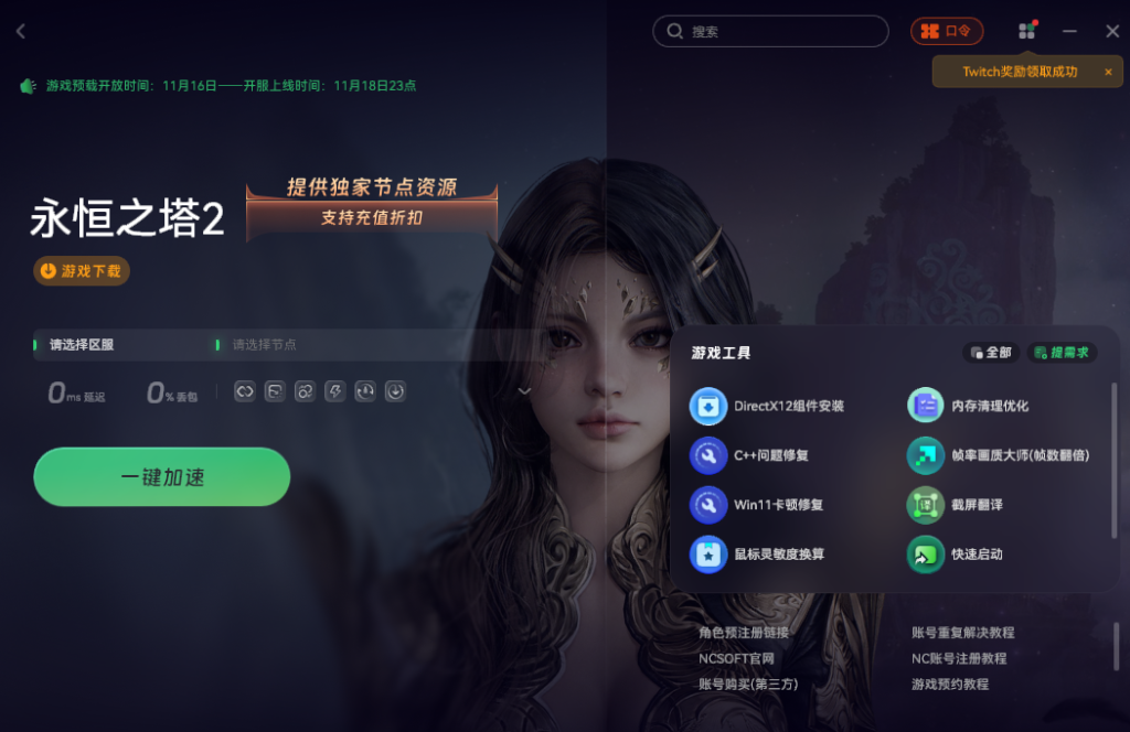 首先,下载前需准备网络加速工具,推荐使用奇游加速器。打开软件后,直接搜索 “永恒之塔 2”,选择台服线路并启动加速,这能确保后续注册、下载过程网络稳定,避免因跨境网络问题导致操作中断或失败。