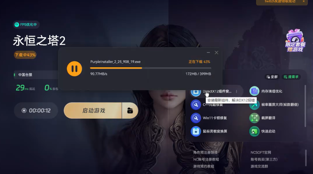 注册完成后返回官网,使用新注册的账号登录。登录成功后,在Purple平台中找到永恒之塔2点击进入游戏详情页面,点击安装按钮下载安装游戏。