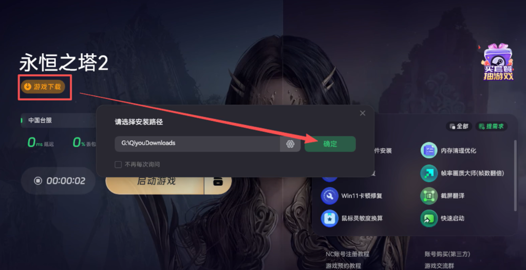 由于永恒之塔2的游戏服务器设在海外,玩家若直接连接网络,可能会遭遇跨境网络带来的诸多问题,比如官网页面加载缓慢、平台下载失败等。为避免这些情况,玩家可以打开奇游加速工具,在右上方的搜索框中输入永恒之塔2然后点击一键优化,以此改善与游戏服务器的连接状况。