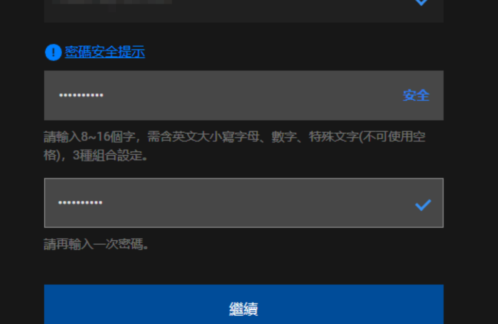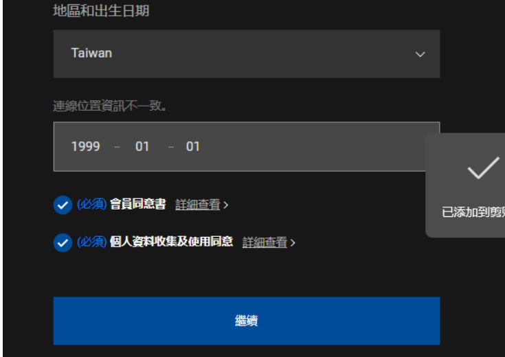 账号地区选台湾,输入满18岁的生日信息后点击继续,再点击确定。接着输入电子邮箱账号,点击发送验证码,收到后输入并确认。设置账号密码时不能出现123这类连续数字,设置完成后点击继续,账号就注册好了。