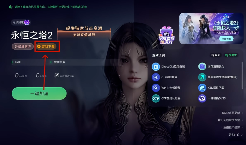 首先玩家们先使用奇游加速工具来优化网络环境。打开奇游加速工具后搜索框永恒之塔2,点击加速选项,为后续的下载与注册流程提供稳定的网络支持。