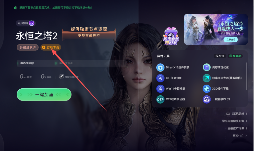 首先需使用网络优化工具确保下载稳定性,推荐使用奇游加速工具。启动程序后,在搜索栏输入永恒之塔2开启加速服务,此时界面将显示游戏下载入口选项。点击游戏下载按钮后,系统会自动跳转至紫P平台的专用下载页面。