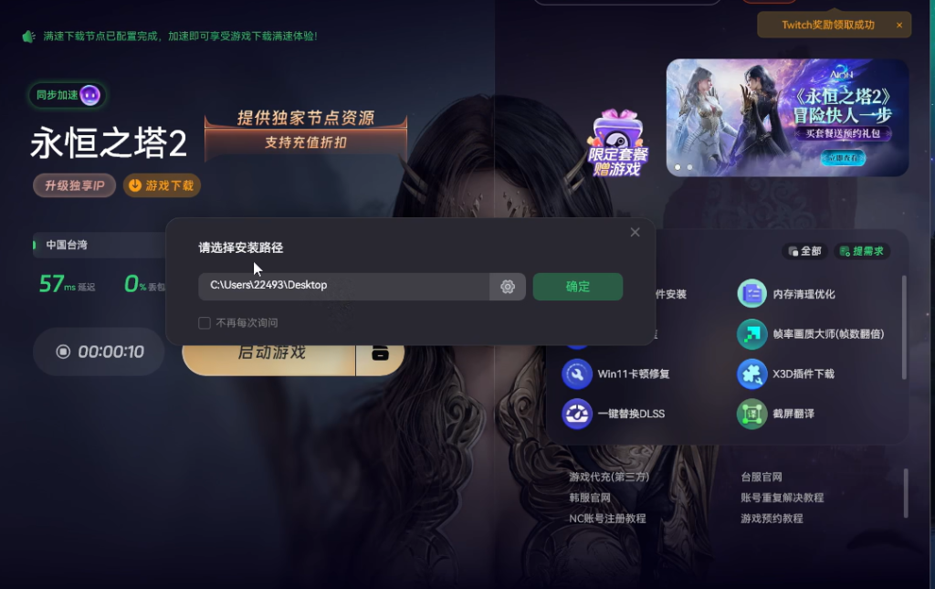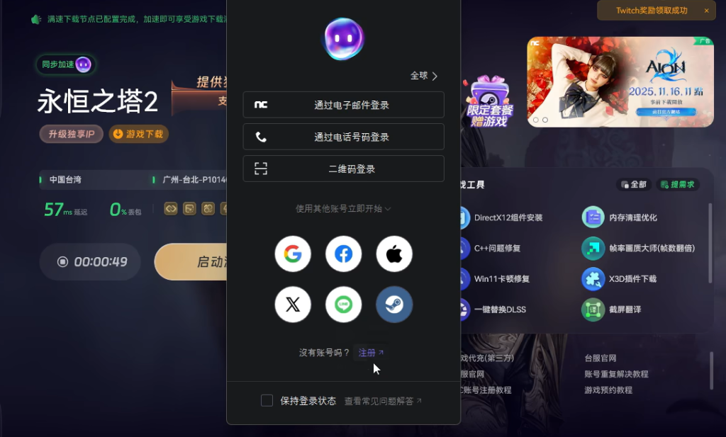 在进行账号注册与下载前,小编建议大家使用奇游加速工具。打开奇游搜索永恒之塔2,然后手动选择台服或韩服专用节点,以此对网络进行优化,确保后续操作能够顺利进行。