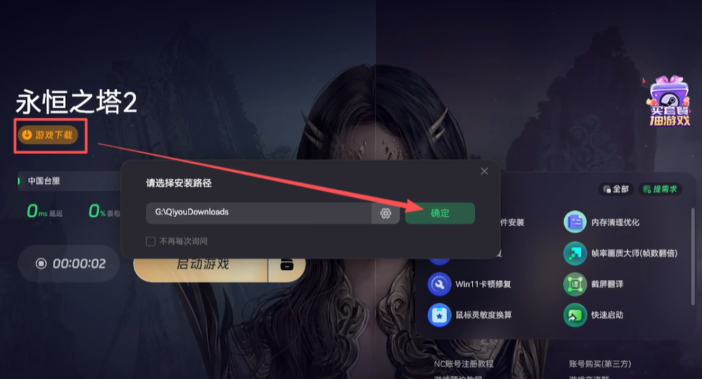完成注册并登录客户端后,进入启动器界面。在这个界面中,找到永恒之塔2的游戏选项,点击安装按钮,系统就会自动开始进行游戏的安装准备工作。