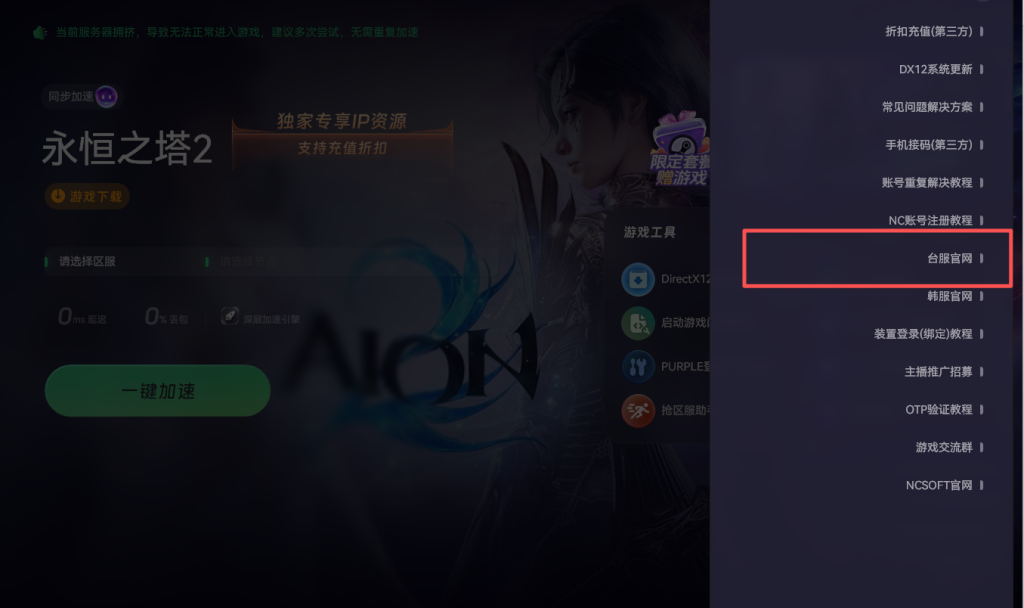 等加速状态稳定下来,就可以点击工具内嵌的官网入口,进入永恒之塔2的台服官网。