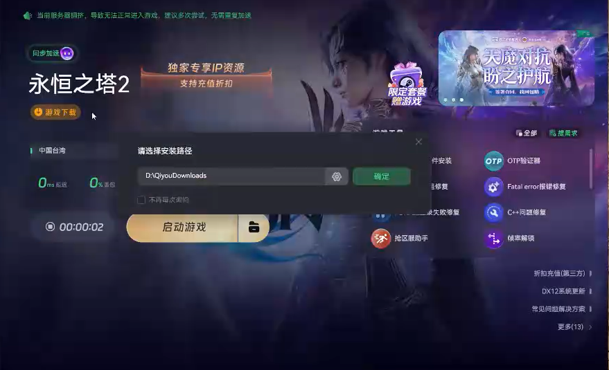 在开始下载之前,优化网络环境是关键的一步。大家可以先下载并安装好奇游加速工具,安装完成后将其打开,在奇游加速工具搜索永恒之塔2,然后点击搜索结果中的加速选项,为后续的下载和注册操作提供稳定的网络支持。