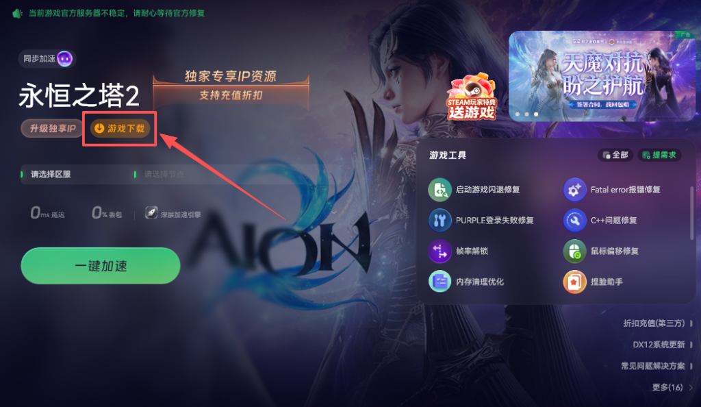 在游戏库中找到《永恒之塔》,就可以开始下载游戏本体了。下载的时候,一定要保持奇游加速工具是开启状态,并且确认加速的还是刚才那个“台服-路由模式”,这样就能跑满自家网速,很快就能下好开始玩了。