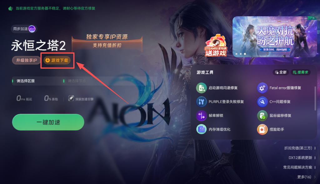 等加速成功,界面一般会有一个“游戏下载”的按钮,点它下载游戏平台客户端。