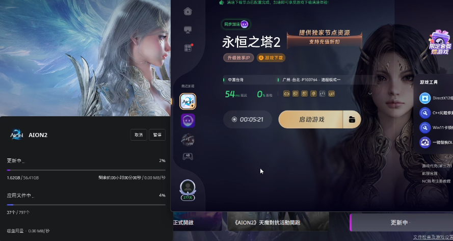 这里提醒一下,下载过程中最好保持加速工具连接不要断开。《永恒之塔》大概57个G,在加速状态下一般二三十分钟就能下完,具体速度看你家的网络情况。