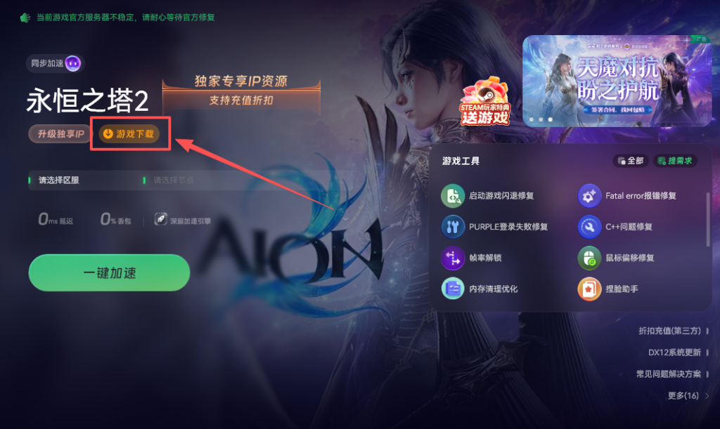 国内玩家需注意,游戏服务器位于台韩地区,直连网络易出现下载卡顿、注册加载失败等问题,奇游加速器可有效解决这类情况。操作时先打开奇游加速器,在搜索栏输入 “永恒之塔 2”,选择对应区服启动加速,其能优化本地网络连接,改善下载缓慢、无法下载等问题。