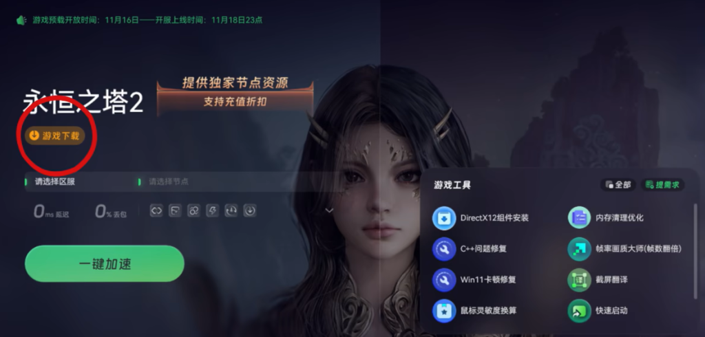 首先玩家们需要通过奇游加速工具搜索永恒之塔2,选择台湾服务器节点并启动加速服务。