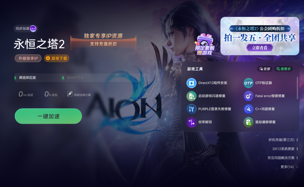 首先需完成网络与游戏安装的准备工作。推荐使用奇游加速器优化网络,打开加速器后搜索 “永恒之塔 2”,为避免操作卡顿,建议选择中国台湾地区的加速节点,点击 “智能加速” 功能即可完成网络配置。