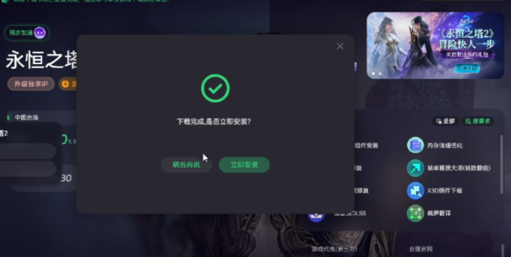 待加速成功,页面上会出现游戏下载按钮,点击就可以下载永恒之塔2的客户端。