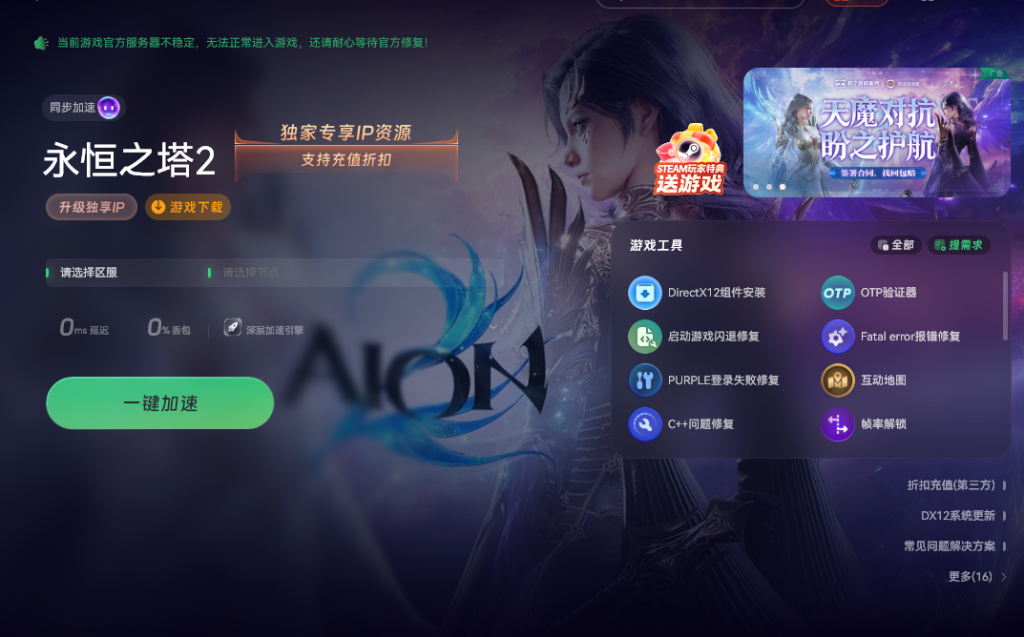 在开始下载前需先准备好一款游戏加速工具。这里以奇游加速工具为例,打开在右上角的搜索框中输入永恒之塔。在加速界面里,要仔细选择区服,选定中国台湾省服,随后开启加速功能。
