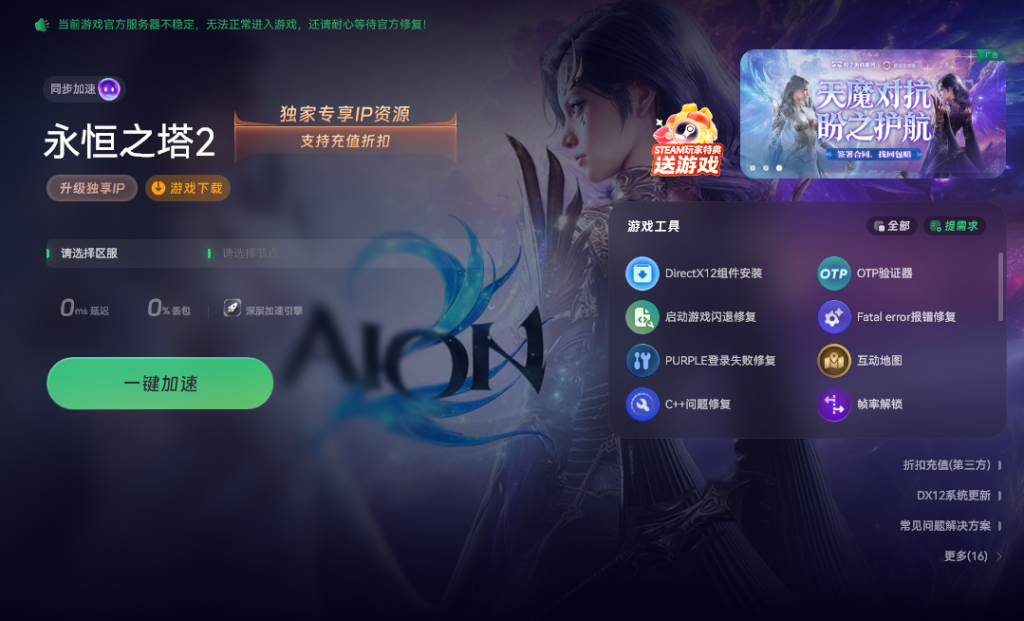 由于服务器在海外,下载游戏前需先启动奇游加速工具,搜索永恒之塔2启动对应加速节点,优化本地网络环境,解决下载卡顿、无法访问等问题。