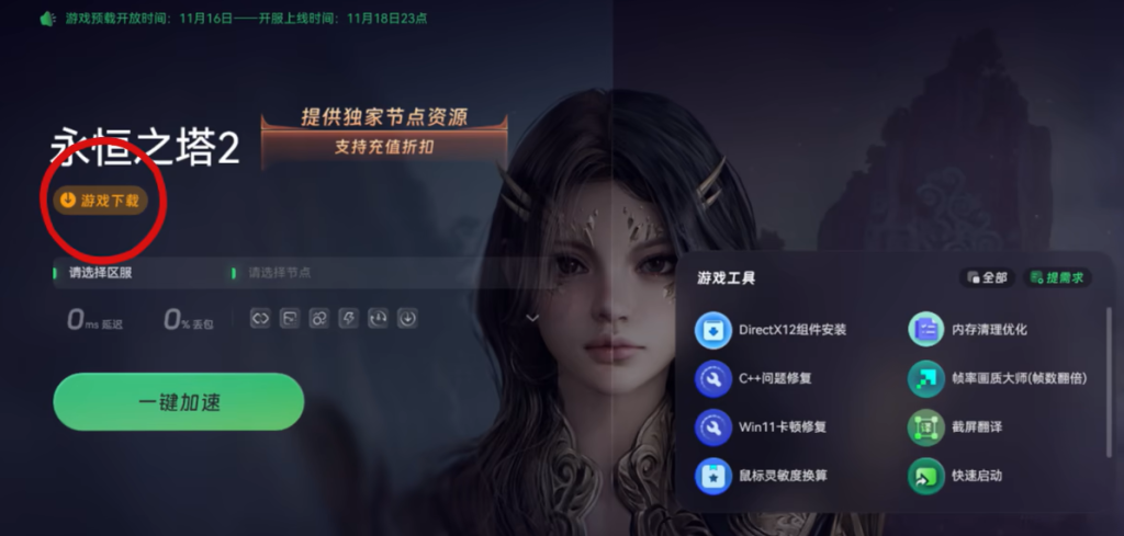 加速成功后,点击界面位置的游戏下载按钮,下载官方指定平台客户端。