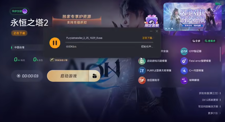 加速操作完成后,在加速页面能够看到游戏下载按钮,点击该按钮开始一键下载。下载结束后,会得到purple的客户端安装包。双击这个安装包,按照安装向导所给出的提示,逐步完成客户端的安装工作。