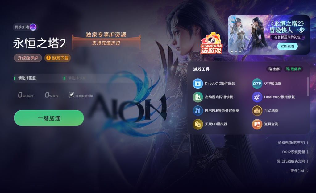 为了保障下载以及后续游戏过程的流畅性,借助专业的网络加速工具十分必要。在此,小编推荐使用奇游加速工具。打开奇游加速工具后,在搜索栏输入永恒之塔 2 台服,然后点击一键加速选项。