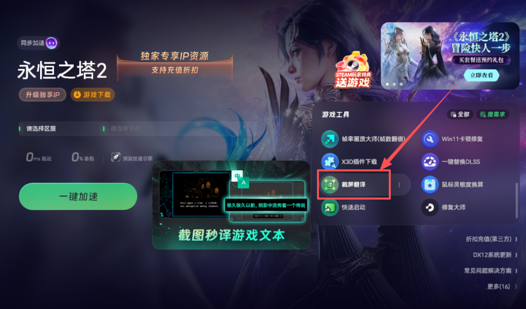 在加速页面的右侧,你会看到一个“截屏翻译”的功能,点击启动它。这个工具能实时把游戏里的文字转换成简体中文。