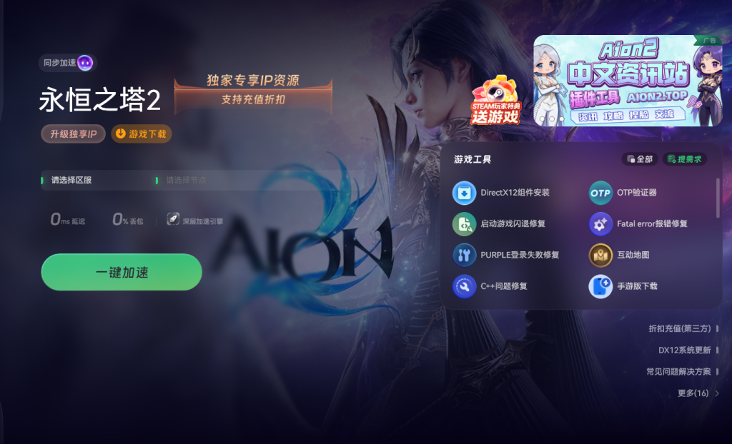 为确保下载及后续游戏过程的顺畅,使用专业的网络加速工具必不可少。小编推荐大家使用奇游加速工具。开启奇游搜索永恒之塔2台服,接着点击一键加速选项。